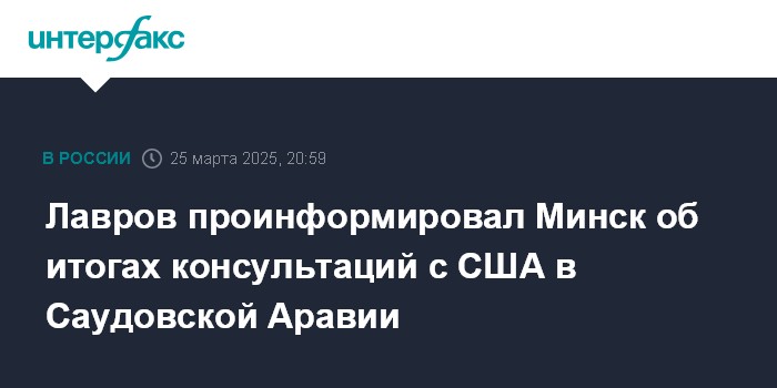 Москва. 25 марта. INTERFAX.RU - Глава МИД России Сергей Лавров проинформировал по телефону белорусского коллегу Максима Рыженкова об итогах консультаций России и США в Эр-Рияде, сообщает российское внешнеполитическое ведомство.