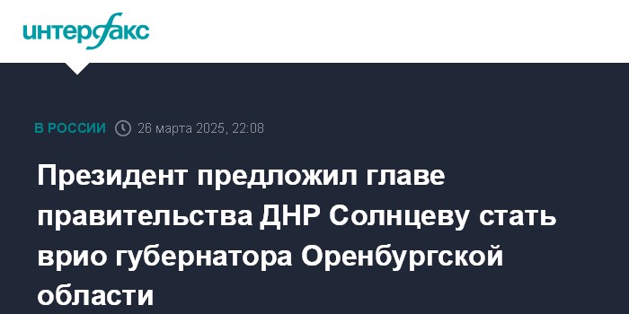 Москва. 26 марта. INTERFAX.RU - Президент РФ Владимир Путин предложил главе правительства ДНР Евгению Солнцеву стать временно исполняющим обязанности губернатора Оренбургской области.