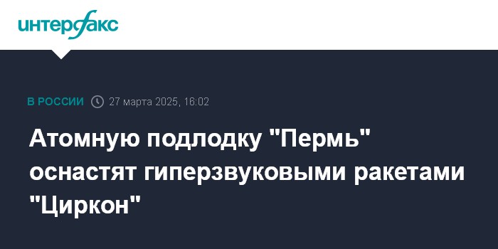 Москва. 27 марта. INTERFAX.RU - Многоцелевая атомная подводная лодка "Пермь" будет оснащена новыми гиперзвуковыми ракетами "Циркон", говорится в материалах к рабочей поездке президента РФ Владимира Путина в Мурманскую область.