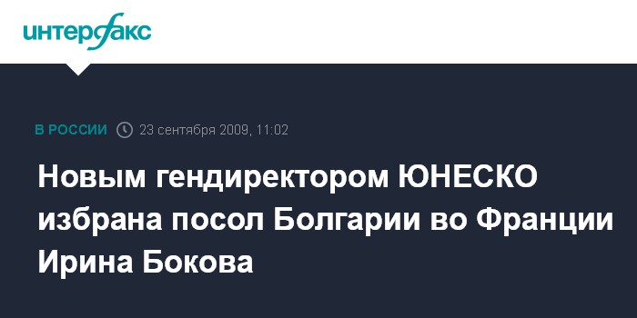 Москва. 23 сентября. INTERFAX.RU - Исполнительный совет ЮНЕСКО избрал посла Болгарии во Франции и постоянного представителя Болгарии при ЮНЕСКО Ирину Бокову новым генеральным директором организации, сообщил по окончании голосования председатель совета Олабийи Бабалола Жозеф Йаи, посол и постоянный представитель Бенина при ЮНЕСКО. По действующей процедуре кандидатура И.Боковой должна быть представлена на утверждение генеральной конференции ЮНЕСКО, которая откроется в Париже 6 октября.