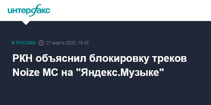 Москва. 27 марта. INTERFAX.RU - Т Роскомнадзор сообщил, что потребовал заблокировать в РФ треки из нового альбома рэпера Noize MC (Ивана Алексеева, внесенного Минюстом в реестр иноагентов) "Не все дома" на "Яндекс.Музыке" за распространение недостоверной общественно-значимой информации (так называемых фейков).