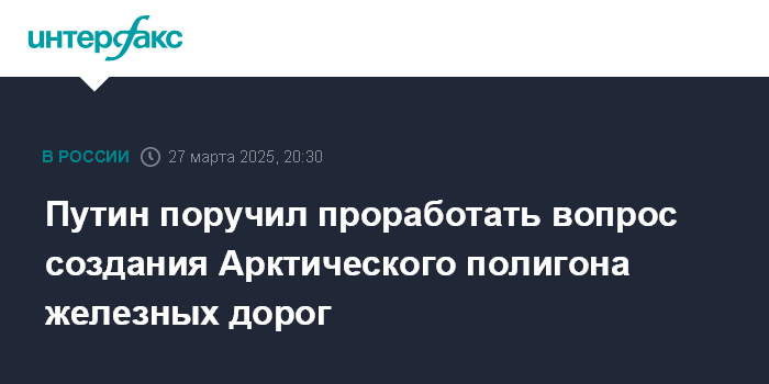 Москва. 27 марта. INTERFAX.RU - Президент РФ Владимир Путин поручил проработать вопрос создания Арктического полигона железных дорог по аналогии с Восточным полигоном ОАО РЖД", а также провести модернизацию Северной железной дороги.