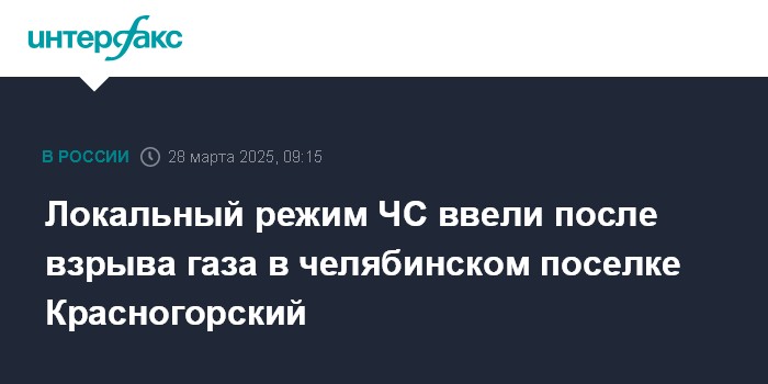 Москва. 28 марта. INTERFAX.RU - Режим ЧС муниципального уровня объявлен в поселке Красногорский Еманжелинского района Челябинской области, где накануне произошел взрыв газа в пятиэтажном доме, сообщает пресс-служба районной администрации в пятницу.