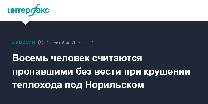 Москва. 23 сентября. INTERFAX.RU - По факту крушения теплохода под Норильском (Красноярский край) возбуждено уголовное дело сообщили агентству "Интерфакс-Сибирь" в Западно-Сибирском следственном управлении на транспорте. "Восемь человек считаются пропавшими без вести, поскольку тела их еще не найдены", - сказал представитель управления. По данным собеседника агентства, на борту теплохода находилось 13 человек - 2 члена экипажа и 11 пассажиров. Среди спасшихся - один член экипажа, четверо пассажиров.