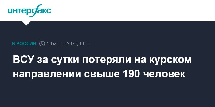 Москва. 29 марта. INTERFAX.RU - Потери ВСУ за минувшие сутки на курском направлении составили свыше 190 военных, сообщило Минобороны РФ в субботу.
