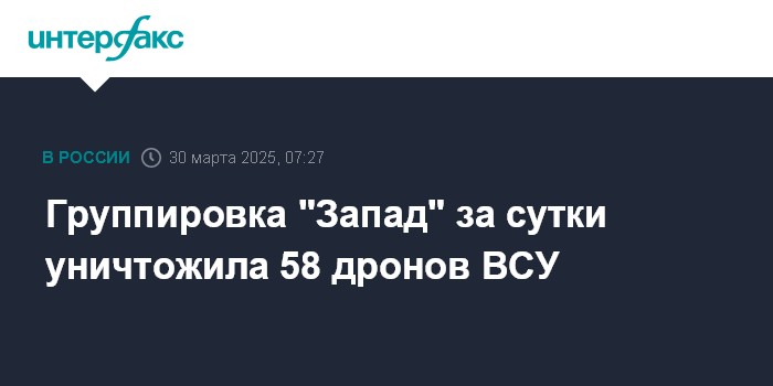 Москва. 30 марта. INTERFAX.RU - В группировке войск "Запад" сообщили об уничтожении в течение суток 58 украинских беспилотников самолетного типа и 24 пунктов управления беспилотной авиацией.