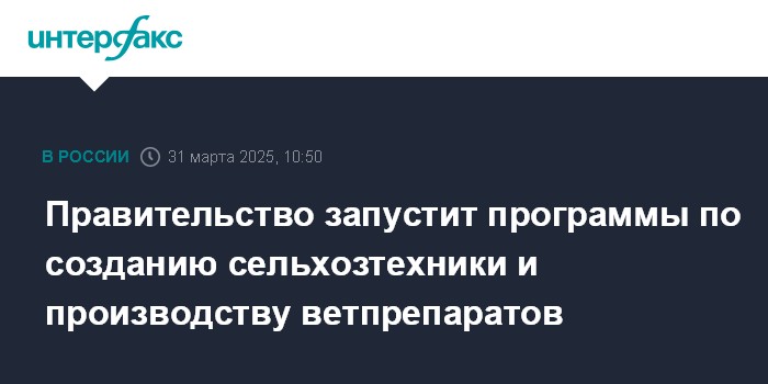 Москва. 31 марта. INTERFAX.RU - Правительство запускает новые программы в сфере создания сельхозтехники и производства ветпрепаратов.