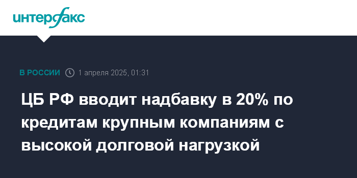 Москва. 1 апреля. INTERFAX.RU - Банк России с 1 апреля вводит надбавку к коэффициентам риска в размере 20% на прирост кредитных требований к крупным компаниям с повышенной долговой нагрузкой.