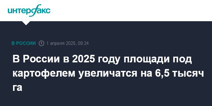 Москва. 1 апреля. INTERFAX.RU - Площади под картофелем в российском организованном секторе (сельхозорганизации, фермеры) в 2025 году увеличатся на 6,5 тысяч га, до 286 тысяч га, сообщает Минсельхоз.