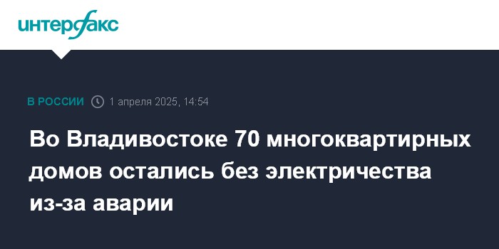 Москва. 1 апреля. INTERFAX.RU - Более 9 тыс. жителей Первомайского района Владивостока остались без электроэнергии из-за аварии на подстанции "Загородная", сообщает прокуратура Приморского края во вторник.