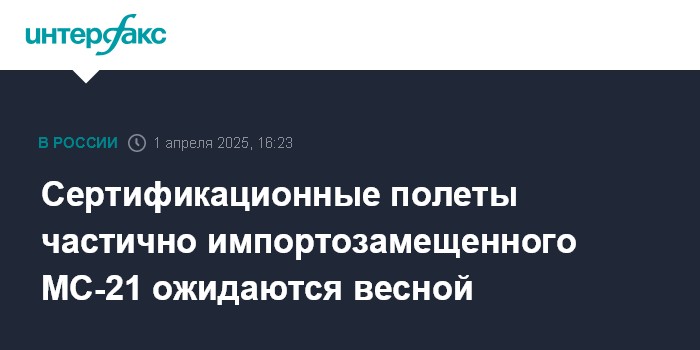 Москва. 1 апреля. INTERFAX.RU - Начало сертификационных полетов частично импортозамещенного самолета МС-21 ожидаются весной этого года, полностью русифицированной версии - летом, сообщил замглавы Минпромторга РФ Геннадий Абраменков на заседании комитета Совета Федерации по экономической политике.