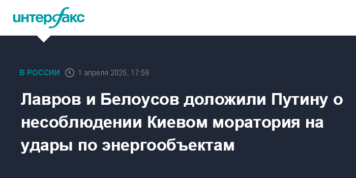 Москва. 1 апреля. INTERFAX.RU - Глава МИД РФ Сергей Лавров сообщил, что вместе с министром обороны Андреем Белоусовым проинформировал президента Владимира Путина о несоблюдении Киевом моратория на удары по объектам энергетической инфраструктуры.