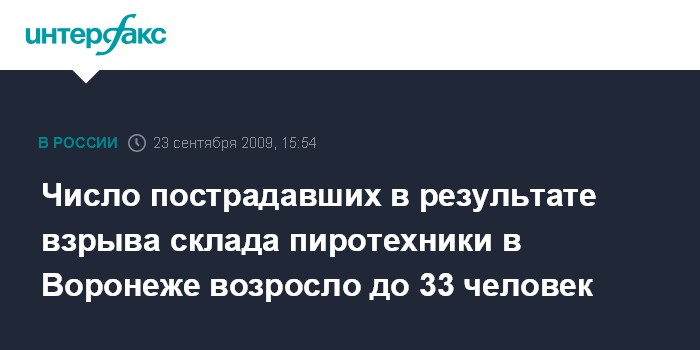 Воронеж. 23 сентября. INTERFAX.RU - При взрыве на складе пиротехники в Воронеже в среду пострадали 33 человека, один погиб, сообщили "Интерфаксу" в региональном управлении МЧС.