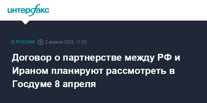 Документ был внесен на ратификацию Госдумой президентом России Владимиром Путиным ранее в марте. Договор был подписан в ходе визита президента Ирана Масуда Пезешкиана в Москву в январе текущего года. В документе зафиксированы правовые рамки для дальнейшего развития сотрудничества Москвы и Тегерана на долгосрочную перспективу. Договор закрепляет статус России и Ирана как стратегических партнеров и охватывает все сферы.