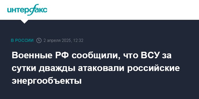 Москва. 2 апреля. INTERFAX.RU - В течение суток Вооруженные силы Украины дважды атаковали объекты российской энергетической инфраструктуры в Курской области, заявили в Минобороны РФ.
