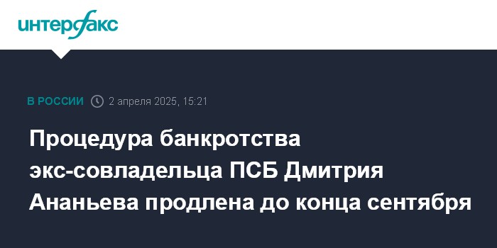 Москва. 2 апреля. INTERFAX.RU - Арбитражный суд Москвы 28 марта по ходатайству финансового управляющего продлил процедуру банкротства экс-совладельца Промсвязьбанка (ПСБ) Дмитрия Ананьева на шесть месяцев.