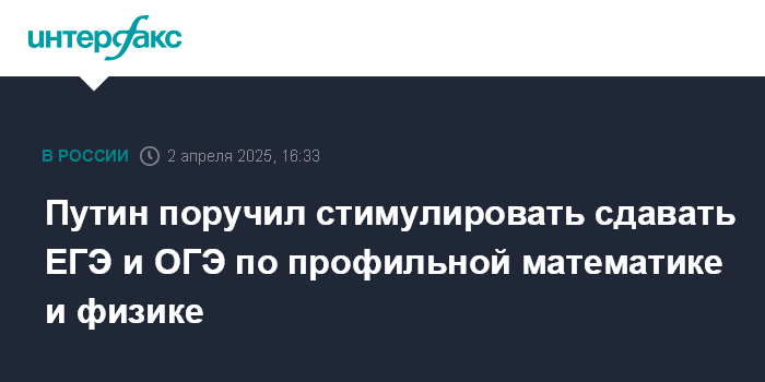 Москва. 2 апреля. INTERFAX.RU - Президент РФ Владимир Путин поручил властям регионов принять меры по стимулированию обучающихся сдавать ОГЭ и ЕГЭ по профильной математике, физике, химии и биологии, а также рекомендовал поощрять учителей за успехи их учеников на олимпиадах.