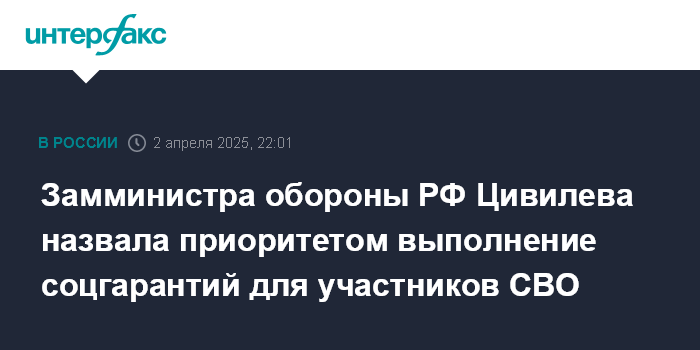Москва. 2 апреля. INTERFAX.RU - Выполнение социальных гарантий в отношении участников СВО является приоритетом в работе министерства обороны, сообщила статс-секретарь - заместитель министра обороны РФ Анна Цивилева.