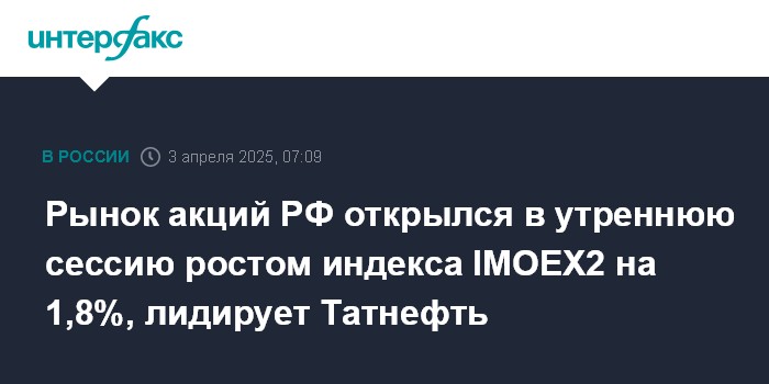 Рынок акций РФ открылся в утреннюю сессию ростом индекса IMOEX2 на 1,8%, лидирует Татнефть