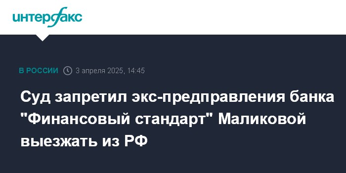 Москва. 3 апреля. INTERFAX.RU - Арбитражный суд Москвы 28 марта по заявлению госкорпорации "Агентство по страхованию вкладов (АСВ, конкурсный управляющий) запретил бывшему председателю правления московского банка "Финансовый стандарт" Ольге Маликовой выезжать из России.