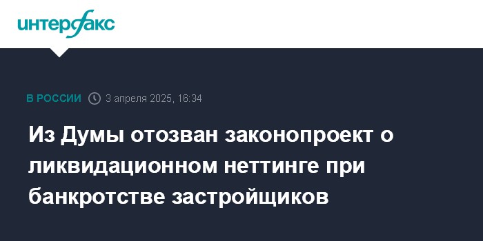 Москва. 3 апреля. INTERFAX.RU - Совет Думы принял решение снять с рассмотрения парламента законопроект, который распространял положения о ликвидационном неттинге на банкротство застройщиков.