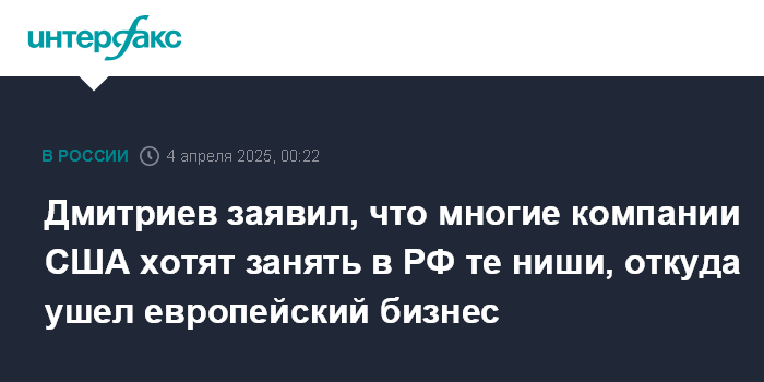 Дмитриев заявил, что многие компании США хотят занять в РФ те ниши, откуда ушел европейский бизнес