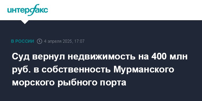 Москва. 4 апреля. INTERFAX.RU - Суд по иску прокуроров вернул в собственность Мурманского морского рыбного порта недвижимость на сумму более 400 млн рублей, незаконно отчужденную бывшими акционерами предприятия, сообщает в пятницу Генпрокуратура РФ.