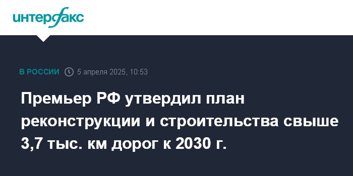 "До 2030 года в России предполагается построить и реконструировать более 3,7 тыс. км автомобильных магистралей. Это предусмотрено шестилетним планом дорожной деятельности, который своим распоряжением утвердил председатель правительства Михаил Мишустин. Документ станет одним из основных инструментов реализации нового национального проекта "Инфраструктура для жизни", - говорится в сообщении на сайте кабмина.
