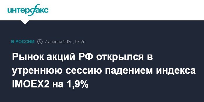 Москва. 7 апреля. INTERFAX.RU - Рынок акций РФ на старте торгов утренней сессии на Мосбирже в понедельник демонстрирует падение на фоне негативной внешней конъюнктуры из-за мировых торговых войн, обострение которых произошло после введения США на прошлой неделе пошлин в отношении 185 иностранных торговых партнеров. Индекс IMOEX2 (все сессии) за минуту торгов упал на 1,9% к уровню закрытия основной сессии предыдущего торгового дня.