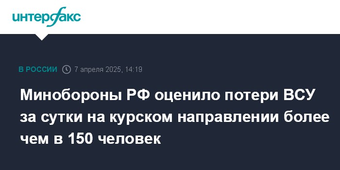 Москва. 7 апреля. INTERFAX.RU - Минобороны России сообщило в понедельник, что суточные потери вооруженных сил Украины на курском направлении составили более 150 человек.