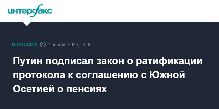 Москва. 7 апреля. INTERFAX.RU - Президент РФ Владимир Путин подписал закон о ратификации протокола о внесении изменений в соглашение России и Южной Осетии о пенсионном обеспечении граждан России, постоянно проживающих в республике, сообщает официальный портал правовой информации.