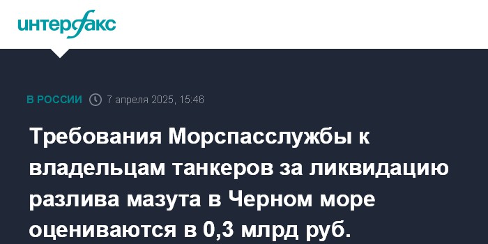 Требования Морспасслужбы к владельцам танкеров за ликвидацию разлива мазута в Черном море оцениваются в 0,3 млрд руб.