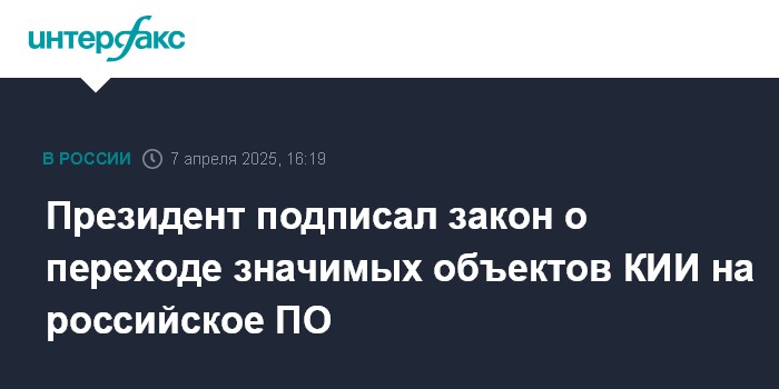 Москва. 7 апреля. INTERFAX.RU - Президент Владимир Путин подписал закон, предусматривающий перевод значимых объектов критической информационной инфраструктуры (КИИ) на использование российского ПО. Документ опубликован на портале нормативных актов.