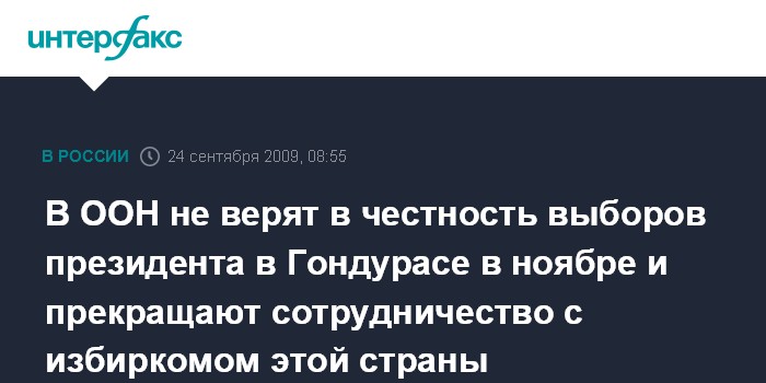 Москва. 24 сентября. INTERFAX.RU - Генеральный секретарь ООН Пан Ги Мун объявил, что организация временно прекращает сотрудничество с избирательной комиссией Гондураса, поскольку президентские выборы, запланированные на ноябрь, вряд ли станут честными, передает британская телерадиокорпорация ВВС.