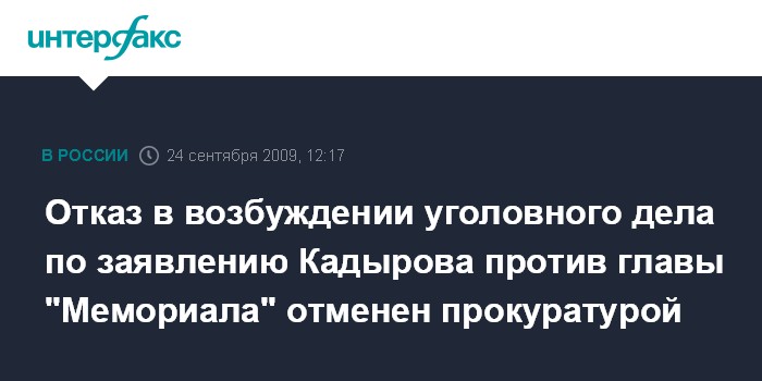 Москва. 24 сентября. INTERFAX.RU - Прокуратура Москвы отменила отказ возбудить уголовное дело в отношении главы центра "Мемориал" Олега Орлова по заявлению президента Чечни Рамзана Кадырова, сообщил адвокат главы Чеченской республики Андрей Красненков. "Я получил письмо из прокуратуры Москвы, где говорится, что постановление ГУВД об отказе в возбуждении уголовного дела против О.Орлова отменено", - сказал Красненков "Интерфаксу" в четверг.