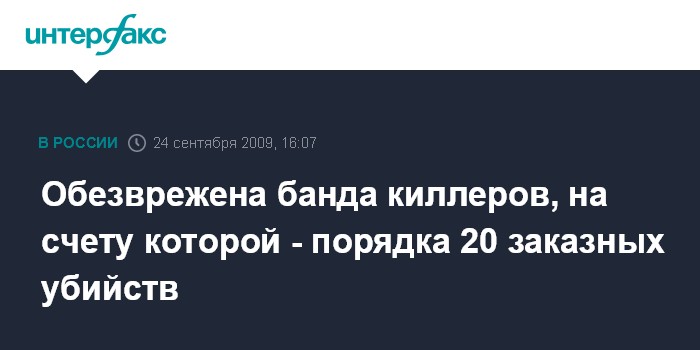 Москва. 24 сентября. INTERFAX.RU - В московском регионе ликвидирована банда наемных убийц, на счету которой около 20 заказных убийств, сообщил замглавы МВД РФ Евгений Школов. "Уголовным розыском в текущем году пресечена деятельность банды киллеров, на счету которой около 20 заказных убийств в Московской и Ростовской областях", - сказал Е.Школов в четверг на совещании с начальниками регионального управления уголовного розыска по Карелии. "Главарь и активные участники этой группировки арестованы", - сказал замглавы МВД, слова которого цитирует пресс-служба департамента уголовного розыска (ДепУР) МВД РФ в сообщении, поступившем в "Интерфакс".