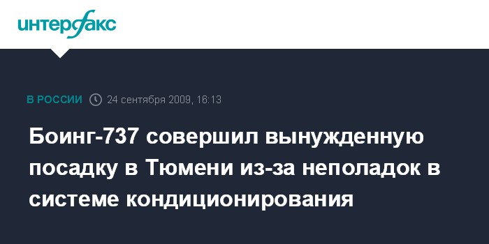 Москва. 24 сентября. INTERFAX.RU - В Тюменском аэропорту "Рощино" вечером 23 сентября совершил вынужденную посадку Боинг-737 авиакомпании "UTair", выполнявший рейс Тюмень-Москва (Домодедово). Как сообщила в четверг агентству "Интерфакс-Урал" помощник Тюменского транспортного прокурора Любовь Иванкова, причиной вынужденной посадки самолета стали неполадки в системе кондиционирования, в связи с чем Боинг, набравший высоту около 10 км, вновь приземлился в тюменском аэропорту. На борту самолета находилось 72 пассажира и 6 человек экипажа. Никто из пассажиров и экипажа не пострадал. По факту вынужденной посадки самолета проводится тщательная проверка.
