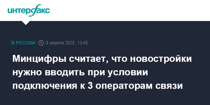 Москва. 9 апреля. INTERFAX.RU - Минцифры РФ считает, что при вводе в эксплуатацию новостроек в них должна быть подключена инфраструктура, как минимум, трех операторов связи, обсуждает с Минстроем введение новых требований, сообщил глава ведомства Максут Шадаев.