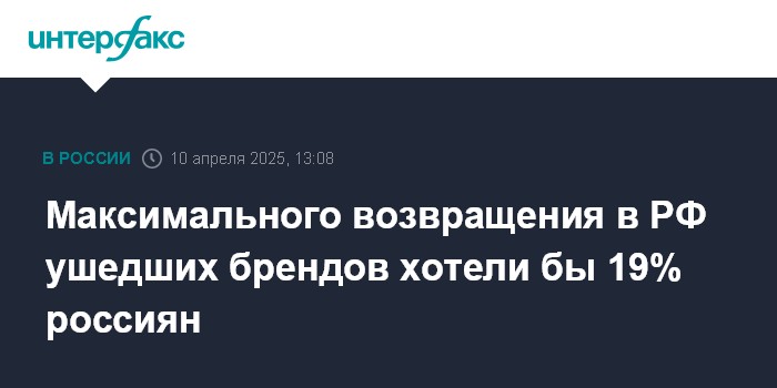 Москва. 10 апреля. INTERFAX.RU - Возвращения всех или почти всех иностранных компаний и брендов, ранее ушедших из России, хотели бы 19% россиян, свидетельствуют данные опроса Фонда "Общественное мнение" (ФОМ), опубликованные на официальном сайте социологического центра.