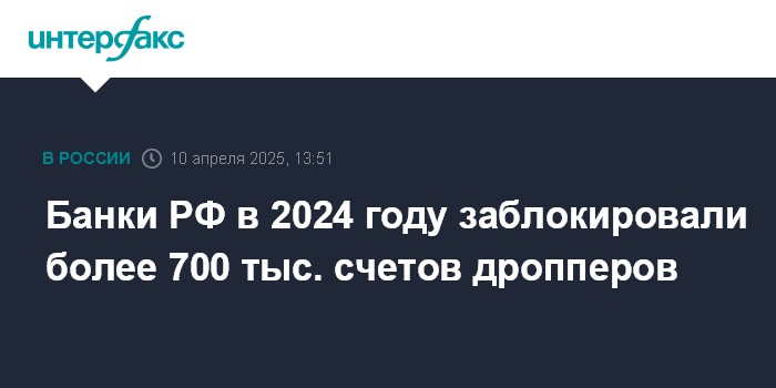 Банки РФ в 2024 году заблокировали более 700 тыс. счетов дропперов