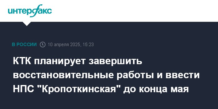 Москва. 10 апреля. INTERFAX.RU - График восстановительных работ на нефтеперекачивающей станции "Кропоткинская" предусматривает ее ввод в эксплуатацию до конца мая 2025 года, сообщил "Каспийский трубопроводный консорциум" (КТК) по итогам посещения объекта генеральным директором КТК Николаем Горбанем.