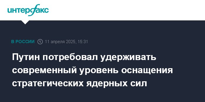 Москва. 11 апреля. INTERFAX.RU - Долю современных образцов вооружения и техники в стратегических ядерных силах в России необходимо удерживать на стопроцентном уровне, заявил президент Владимир Путин на совещании по развитию ВМФ.