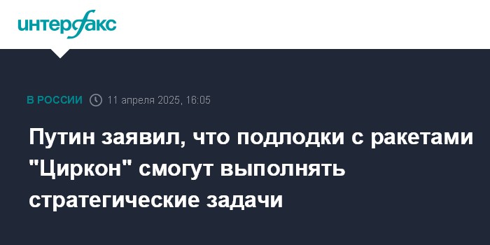 Москва. 11 апреля. INTERFAX.RU - Характеристики гиперзвуковой ракеты "Циркон", которой оснащена новая российская многоцелевая атомная подлодка "Пермь", приближают это оружие к стратегическому, заявил президент РФ Владимир Путин.