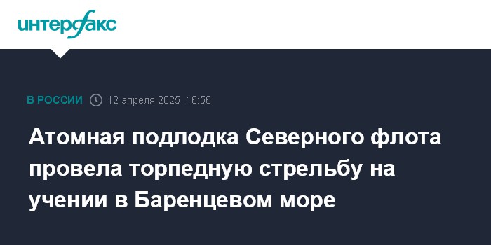Москва. 12 апреля. INTERFAX.RU - Северный флот сообщил, что атомная подлодка в ходе маневров в Баренцевом море выполнила стрельбу учебными торпедами по отряду кораблей условного противника.