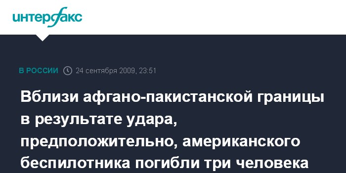 Лондон. 24 сентября. ИНТЕРФАКС - По меньшей мере, три человека погибли в результате авиаудара, предположительно, американского беспилотника в Северном Вазиристане на границе Пакистана с Афганистаном.