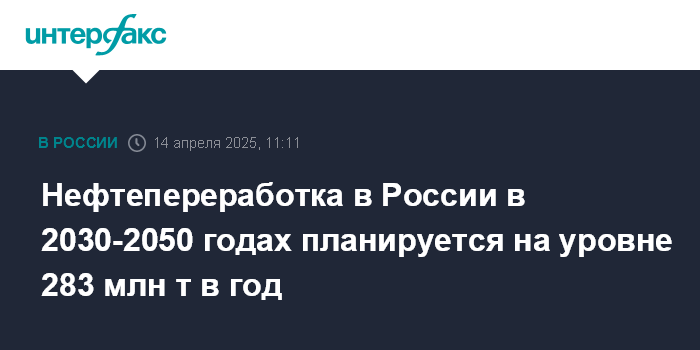 Москва. 14 апреля. INTERFAX.RU - Целевой сценарий утвержденной Энергетической стратегии России до 2050 года предполагает нефтепереработку в период 2030-2050гг на уровне 283 млн тонн по сравнению с 275 млн тонн в 2023 году, говорится в документе.