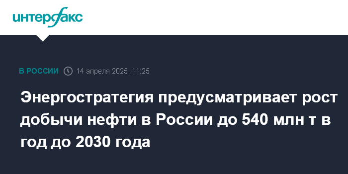 Москва. 14 апреля. INTERFAX.RU - В России добыча нефти с конденсатом в 2030 году вырастет до 540 млн тонн в год по целевому варианту утвержденной Энергостратегии до 2050 года, говорится в документе.
