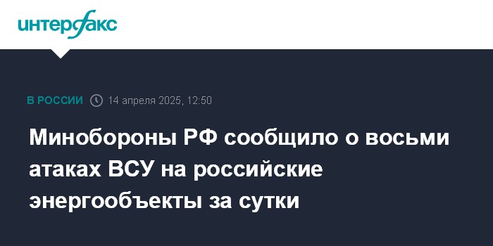 Москва. 14 апреля. INTERFAX.RU - Вооруженные силы Украины за минувшие сутки восемь раз атаковали объекты российской энергетической инфраструктуры, сообщает министерство обороны РФ в понедельник.