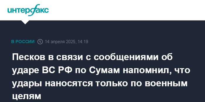 Москва. 14 апреля. INTERFAX.RU -Пресс-секретарь президента РФ Дмитрий Песков в связи с сообщениями о российской атаке на город Сумы заявил, что военные РФ наносят удары только по военным и околовоенным целям.