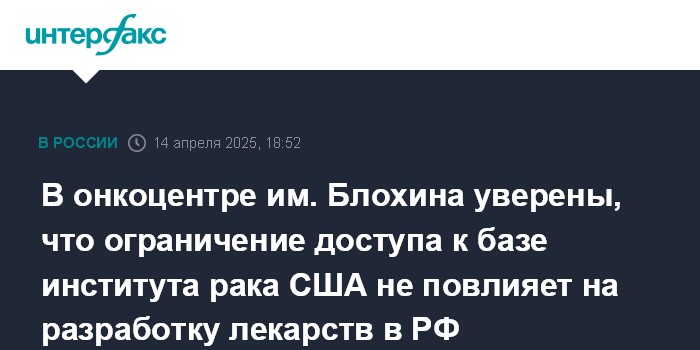 Москва. 14 апреля. INTERFAX.RU - Блокировка доступа к базе Национального института рака США SEER не отразится на российских исследованиях и разработке лекарственных препаратов в стране, заявил заведующий отделом планирования и координации научных исследований НМИЦ онкологии им. Н.Н. Блохина Минздрава России Сергей Гордеев.